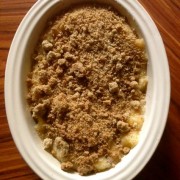 Scatter the crumble on top as deeply or shallowly as you like. Any excess freezes beautifully. Serve as it is or with custard if you feel cosy or creme fraiche if you feel sophisticated.